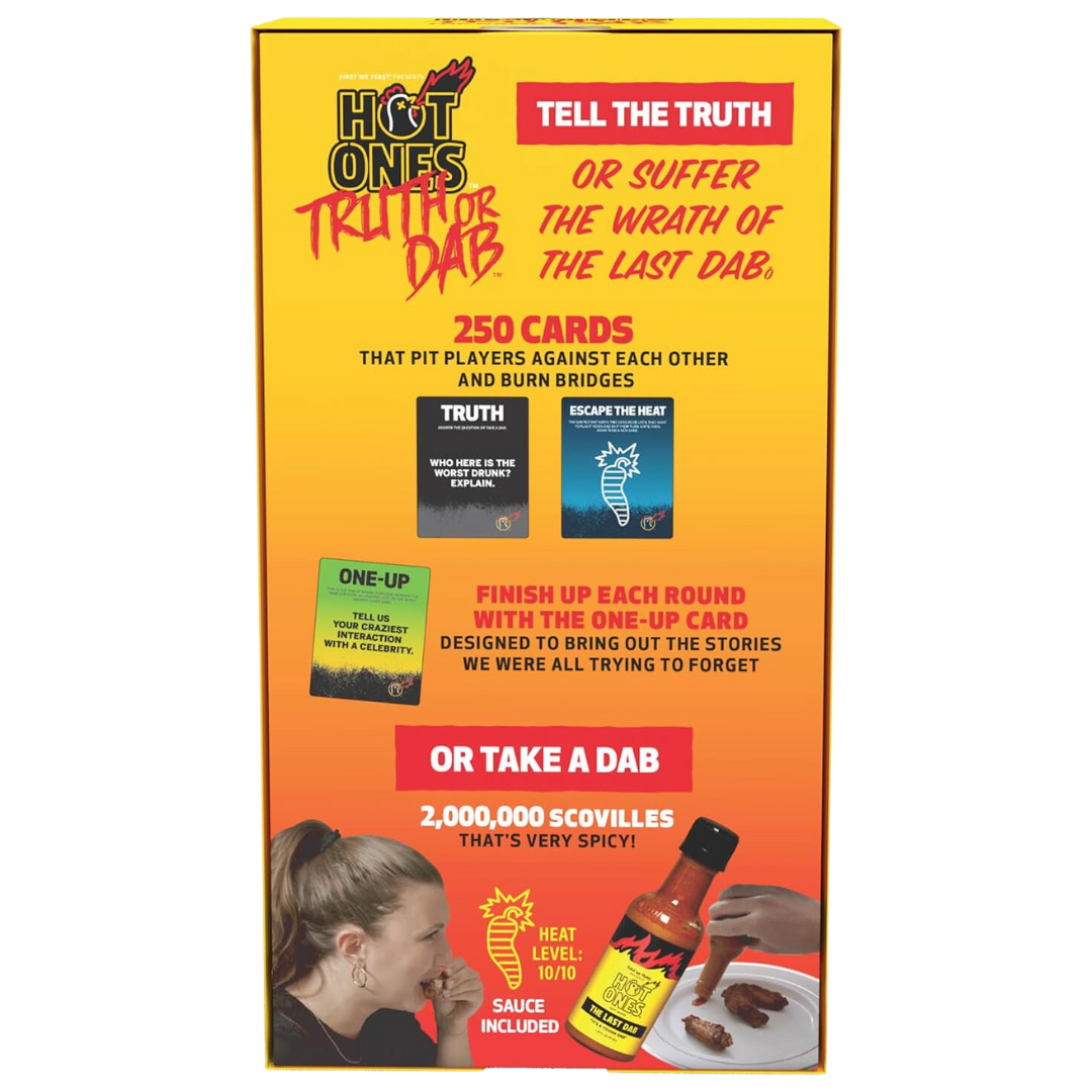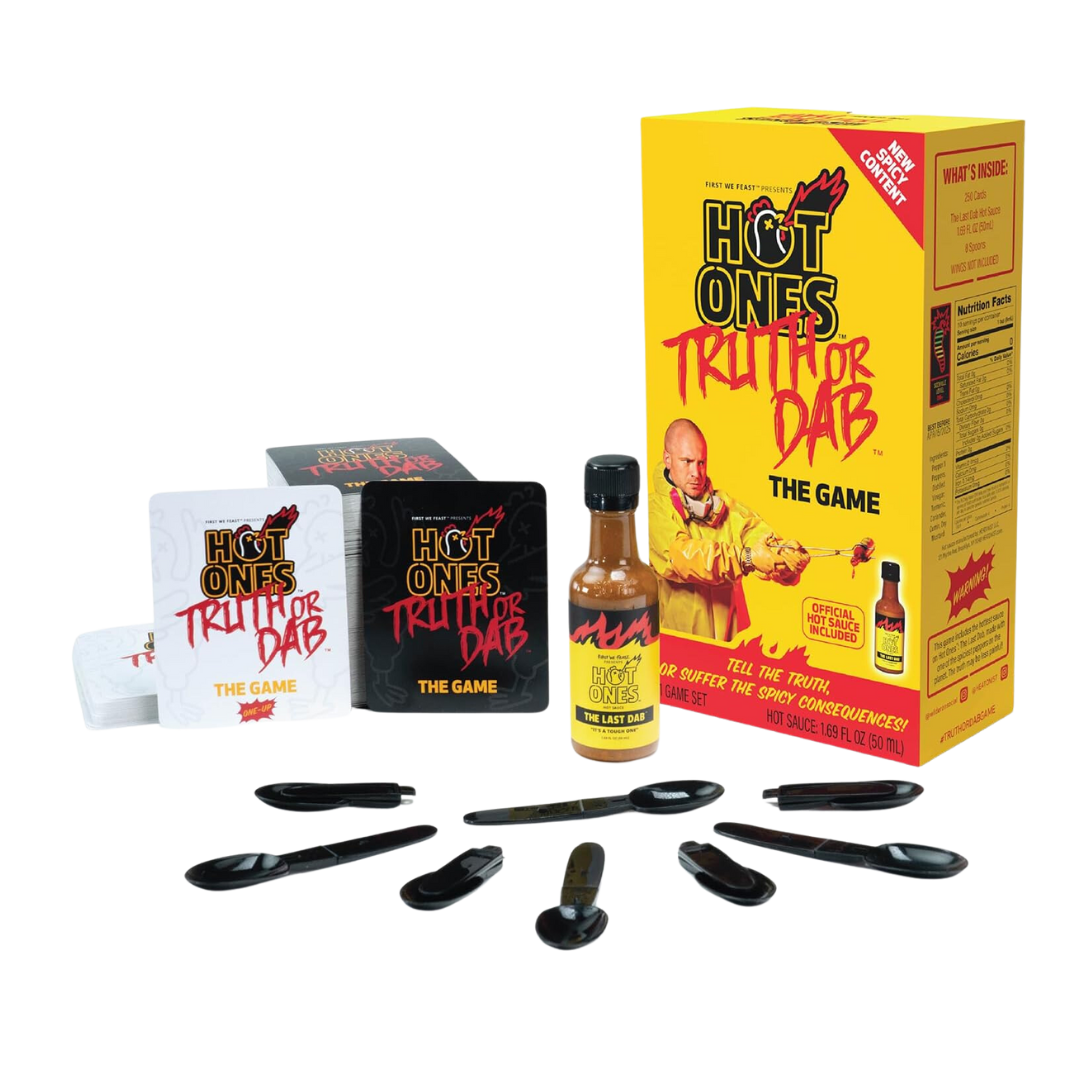The Hot Ones: Truth or Dab Game brings the fiery heat of the legendary Hot Ones show straight to your game nights! Face off with friends in this high-stakes party game where you must answer revealing questions or take on the ultimate challenge—a dab of the infamous Last Dab hot sauce! With 250 thought-provoking and hilarious question cards, plus the included bottle of fiery Last Dab sauce, this game is perfect for fans of spice and social games alike. Will you tell the truth or feel the burn? Find out in this unforgettable challenge!